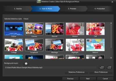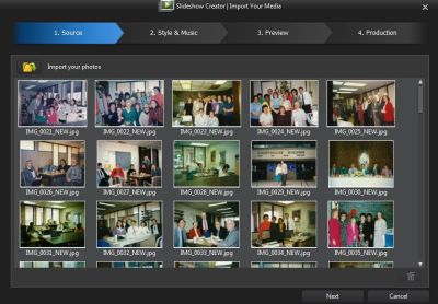 Here is the opening screen of the Slideshow Creator after I’ve loaded some images into it. As you can see, there are only four steps: Source (this screen), Style and Music, Preview, and Production.